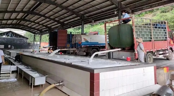 膠農(nóng)在海南橡膠收膠站點(diǎn)賣(mài)膠水。